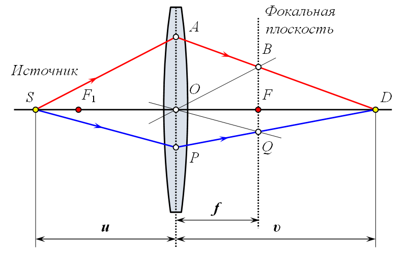 Обозначим расстояние SO от линзы до источника света через u, расстояние OD от линзы до точки фокусировки лучей через v, фокусное расстояние OF через f. Выведем формулу, связывающую эти величины.