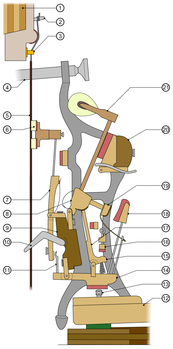 - Абник. Регулировочный винт ограничивает высоту подъёма репетиционного рычага (см. ниже).