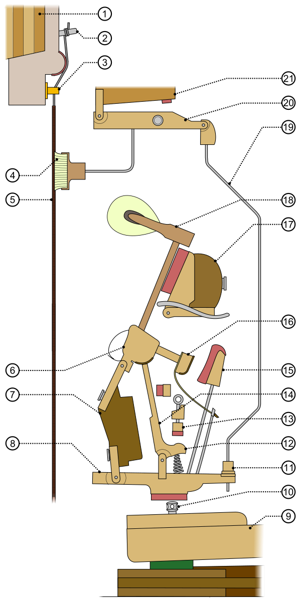 На рисунке справа обозначены следующие детали механики рояля[3]: