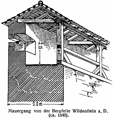 Типичным представителем первого периода долговременной фортификации являются каменные оборонительные ограды в виде высоких каменных или кирпичных стен с отвесными сторонами и плоскою верхней поверхностью, на которой помещались защитники крепости (черт. 10).