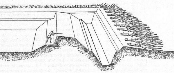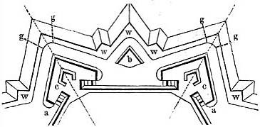 - Первое условие достигается устройством сомкнутой оборонительной ограды с преградой, обстреливаемой сильным огнём из построек, неуязвимых издали; такой преградой бывает обыкновенно наружный ров, обстреливаемый продольным картечным огнём.