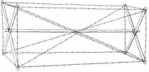 Волчьи ямы не представляют достаточно серьёзной преграды и не выносят продолжительной службы; их часто усиливают другими препятствиями или забивают в дно ям и между ними заостренные сверху колья. Из дерева устраивают шахматные колья, засеку и палисады. Засека (черт. 8) — одно из серьёзнейших и наиболее трудно уничтожаемых препятствий; устраивается она очень скоро; иногда засеку усиливают, оплетая деревья проволокой. Если имеется достаточно проволоки, то устраивают проволочную сеть (черт. 9); проволочная сеть — отличная преграда, лучше всех других сопротивляющаяся артиллерийскому огню; состоит из нескольких рядов забитых в землю кольев, между которыми в разных направлениях натянута проволока.