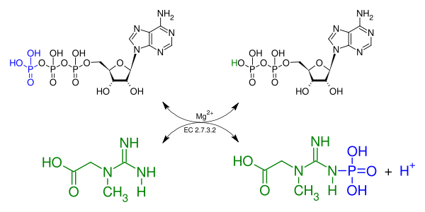 Фактическая биомолекула, используемая в качестве фосфагена, зависит от организма. Большинство животных используют аргинин как фосфаген; однако хордовые (позвоночные животные) используют креатин. Креатинфосфат или фосфокреатин вырабатывается из АТФ ферментом креатинкиназой в обратимой реакции: