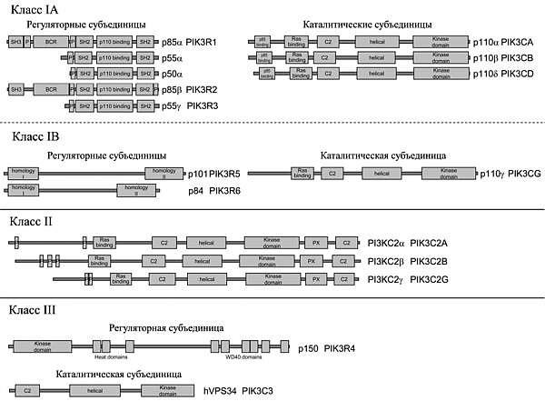 Существует 3 класса фосфоинозитид-3-киназ, которые отличаются по структурной организации, субстратной специфичности и функциям в клетке.