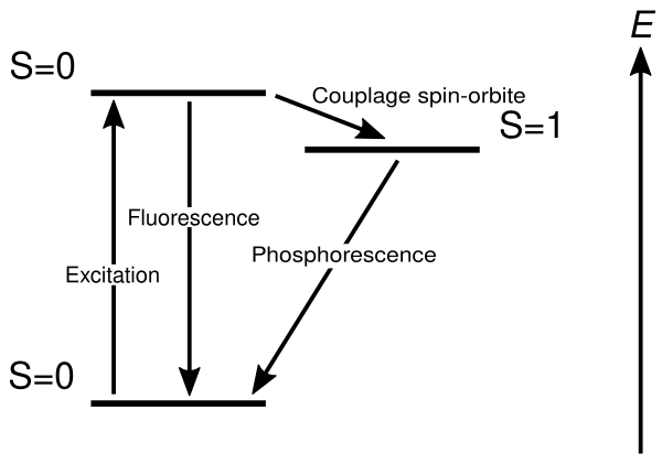 Фосфоресценция органических молекул связана с запрещёнными переходами между энергетическими уровнями разной мультиплетности. Электронные переходы в молекулах удобно описывать с помощью диаграммы Яблонского. При поглощении энергии молекула переходит из основного синглетного состояния S0 в возбуждённое синглетное S1. В таком возбуждённом состоянии молекула может пребывать порядка нескольких наносекунд, а затем сразу же освобождается от лишней энергии, которая либо уходит в тепло, либо испускается в виде света — так называемая быстрая флуоресценция.