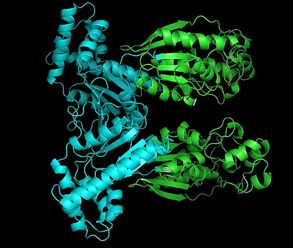 Каждый мономер данного белка разделён на два функциональных домена. Киназный домен расположен на N-конце[2]. Он состоит из шести-тяжевого бета-листа, в котором пять параллельных тяжей и один антипараллельный тяж, окружённый шестью альфа-спиралями[3]. Этот домен содержит нуклеотид-связывающую укладку (англ. nucleotide-binding fold) на C-конце первого β-тяжа[4], что объединяет его со структурой аденилаткиназы.