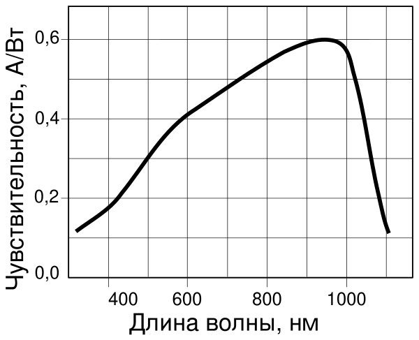- зависимость фототока от длины волны падающего света на фотодиод. Она определяется со стороны больших длин волн шириной запрещённой зоны, при малых длинах волн большим показателем поглощения и увеличения влияния поверхностной рекомбинации носителей заряда с уменьшением длины волны квантов света. То есть коротковолновая граница чувствительности зависит от толщины базы и от скорости поверхностной рекомбинации. Положение максимума в спектральной характеристике фотодиода сильно зависит от степени роста коэффициента поглощения.