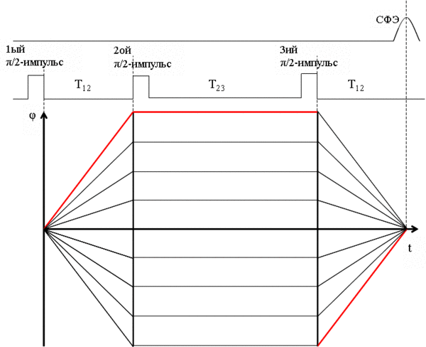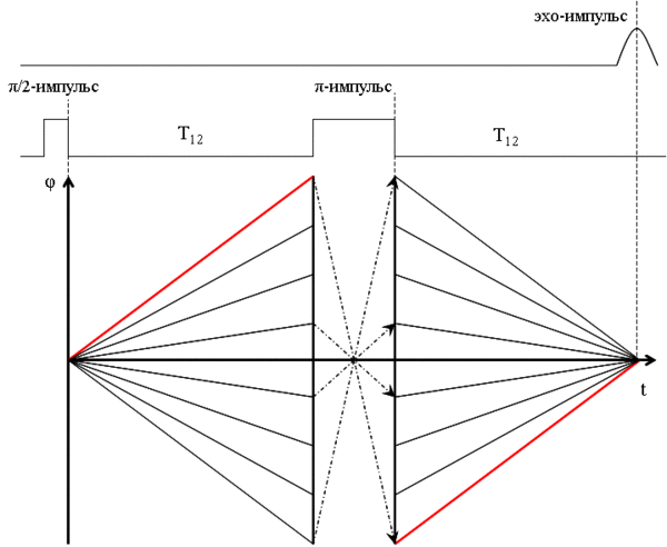 Под действием второго импульса допплеровские фазы осцилляторов изменяют знак, и расфазировка сменяется фазировкой (π-импульс). Когда все осцилляторы оказываются вновь полностью сфазированными, формируется эхо-импульс когерентного излучения.
