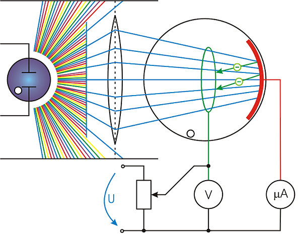 Напряжение обратной полярности, подаваемое на электроды, уменьшает ток фотоэффекта, поскольку электронам приходится совершать дополнительную работу по преодолению электростатических сил. Минимальное напряжение, полностью прекращающее фототок, называется задерживающим или запирающим напряжением. Максимальная кинетическая энергия электронов выражается через задерживающее напряжение: