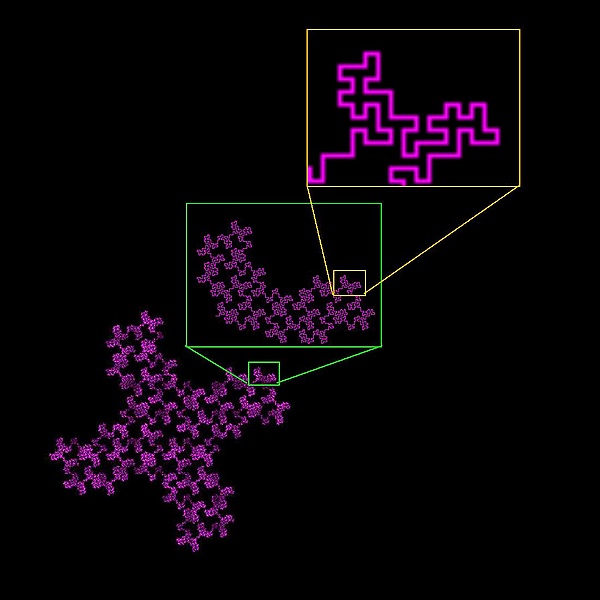 Таким образом, для фрактала, описанного через =4, когда =1⁄3, =1.2619. В этом случае размерность принимает не целое значение, следовательно, можно предполагать, что фрактал имеет размерность не равную размерности пространства, в которое он встроен[7].Этот же масштаб используется для Кривой Коха и снежинки Коха. Следует отметить, что сами эти изображения не являются истинными фракталами, поскольку масштабирование описано значением не может продолжать бесконечно по той простой причине, что изображения, существует только в наименьшей точке — пикселя. Теоретическая структура, которая представляет цифровое изображение, не имеет дискретных пикселей, как куски, а состоит из бесконечного числа сегментов под разными углами с фрактальной размерностью равной 1.2619[4][23].