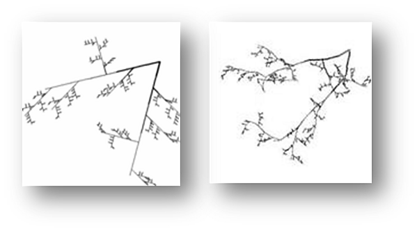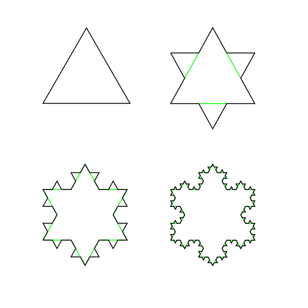 Примеры фракталов: см. Фрактал, Треугольник Серпинского, Множество Мандельброта, Диффузия ограниченной агрегации, L-Системы.