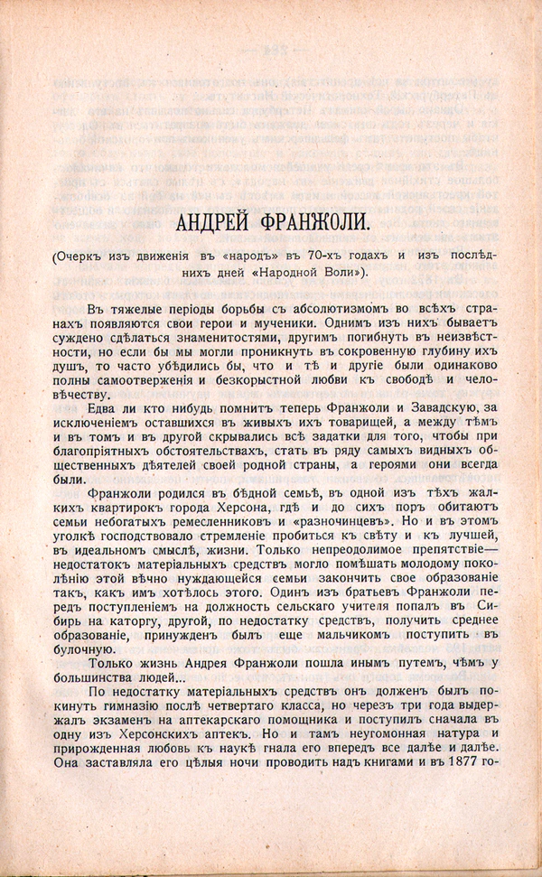 А Андрей Франжоли занимался именно той работой, которая так беспокоила столичных жандармов. Вернувшись из Петербурга на родину в 1871 году, он организовал в Херсоне библиотеку «чайковцев». С. А. Сильванский утверждал, что А. А. Франжоли не просто был вынужден покинуть столицу, но он был выслан оттуда за участие в студенческих волнениях. В родной город вместе с идеями Первого Интернационала Андрей привёз труды Фердинанда Лассаля, В. В. Берви-Флеровского, Н. Г. Чернышевского, Н. А. Добролюбова, Д. И. Писарева, «Исторические письма» П. Л. Лаврова. Таким образом, книги названных авторов положили начало библиотеке херсонского кружка семидесятников. И это была первая херсонская библиотека политической литературы, достаточно крупная по размерам. Она находилась на подпольном положении, несмотря на то что большинство книг было вполне легально издано. Вместе с тем незначительное количество привезённых из Петербурга брошюр было издано нелегально: народническая программа журнала «Вперёд!» Петра Лаврова, памфлет французского аббата-социалиста Ламенне «Слово верующего в народ» и так далее. Вероятнее всего, библиотека хранилась в лабораторной комнате всё той же аптеки Мюллера, в которой по ночам так любила собираться революционно-настроенная молодёжь Херсона. Нелегальные издания этой библиотеки были первой подобной литературой, оказавшейся в распоряжении А. А. Франжоли, М. Р. Ланганса, А. О. Лукашевича, Н. П. Макавеева, Е. А. Болотниковой и других херсонских семидесятников. Первая херсонская Общественная библиотека начала свою работу лишь год спустя, 18 июля 1872 года, но, разумеется, она совсем не располагала нелегальной и острополитической литературой[21].