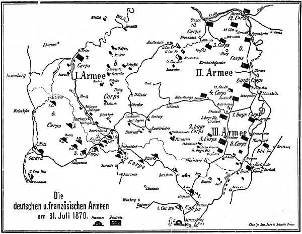 К 1 августа пять французских корпусов (2-й, 3-й, 4-й, 5-й и гвардейский) сосредоточились в Лотарингии, на реке Саар; за ними в Шалоне, Суассоне и Париже были расположены войска 6-го корпуса; 1-й и 7-й корпуса стояли в Эльзасе, у Страсбурга и Бельфора, три резервных кавалерийских дивизии — в Понт-а-Муссоне и Люневилле. Общая численность французских войск доходила до 200 тысяч человек. Главное начальство над ними принял сам император, с Лебёфом в качестве начальника штаба. К тому же времени передовые германские войска (около 330 тыс.), разделённые на 3 армии, развернулись на линии Трир-Ландау.