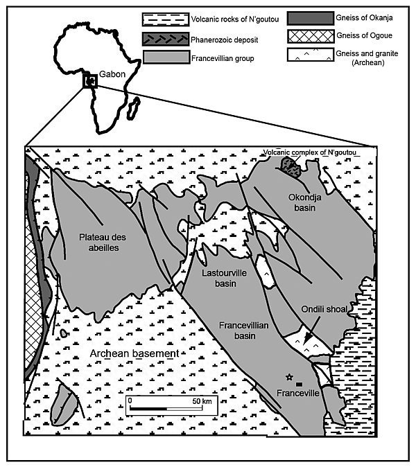 В сланцах бассейна Франсвиль в виде нитей обнаружены окаменелости древнейших многоклеточных подвижных организмов возрастом ок. 2,1±0,3 млрд лет назад (палеопротерозой). Габонские находки попадают во временной интервал 2,2—2,06 млрд л. н., что соответствует так называемой изотопной экскурсии Ломагунди (Lomagundi carbon isotope excursion). Возможно, кислородный пик привёл к появлению неких многоклеточных форм жизни за 300 млн лет до появления эукариотической клетки[6][7].