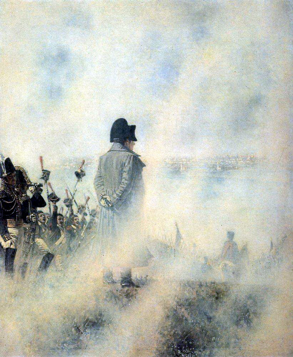 2 (14) сентября 1812 год во вторник в 2 часа дня Наполеон прибыл на Поклонную гору, отстоявшую от Москвы (в её границах на 1812 год) на расстоянии 3 вёрст[K 2]. Там по распоряжению неаполитанского короля Мюрата был построен в боевой порядок авангард французских войск. Здесь Наполеон в течение получаса ожидал, а затем, не увидев со стороны Москвы никаких действий противника, приказал выстрелом из пушки дать сигнал к дальнейшему движению французских войск на Москву. Конница и артиллерия на лошадях скакали во весь опор, а пехота бежала. Достигнув приблизительно через четверть часа Дорогомиловской заставы, Наполеон спешился у Камер-Коллежского вала и начал расхаживать взад и вперёд, ожидая из Москвы делегации или выноса городских ключей. Пехота и артиллерия под музыку стала входить в город.