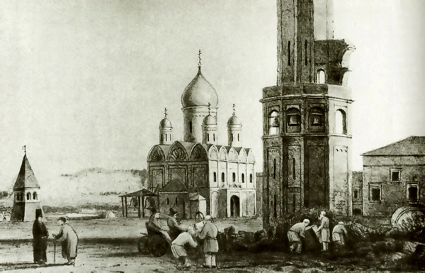 Огромная пристройка к Ивану Великому, оторванная взрывом, обрушилась подле него и на его подножия, а он стоял так же величественно, как только что воздвигнутый Борисом Годуновым для прокормления работников в голодное время, будто насмехаясь над бесплодною яростию варварства XIX века.