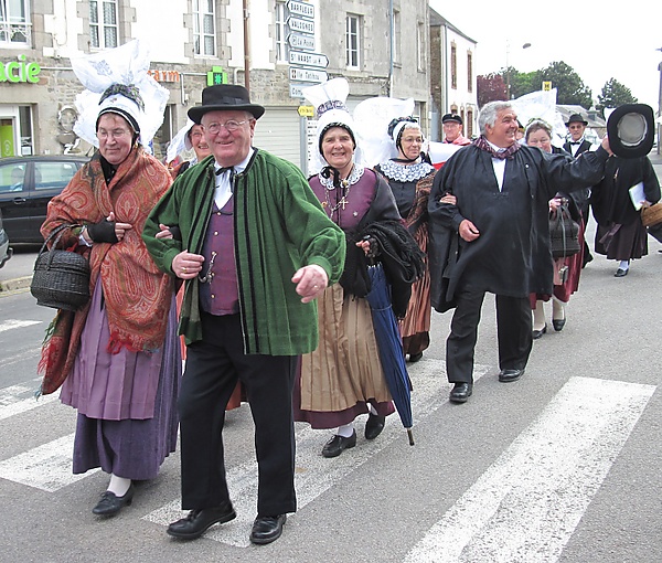 Праздничный костюм конца XIX-начала XX века выглядел следующим образом. Женский костюм имел тёмную гамму и состоял из приталенной кофты и длинной и свободной юбки, изготовлявшиеся из дорогих тканей — муара, парчовых атласов, шёлка. Манжеты рукавов кофты и по низу подола юбки украшались чёрными бархатными лентами. К шейному вырезу могли прикрепляться кружевные вороты. На плечи могли набрасываться шали из хлопкового муслина с полосками вышитого хлопкового тюля. Под юбкой носили панталоны и белые нижние хлопчатобумажные юбки, как и панталоны, отделанные снизу кружевом или бродери англез. Весьма узнаваемый облик имеет праздничный чепец фр. barbichet, изготовлявшийся из белого хлопкового муслина, и по форме отдалённо напоминающий бабочку. Существовало три вида этого головного убора: обычная, траурная и полутраурная. Мужчины носили костюм-тройку — рубашку, штаны, жилет и сюртук с длинными фалдами сзади, головным убором служила чёрная фетровая шляпа, в качестве галстука в виде банта повязывался плат из чёрного бархата (фр. vittou)[26].