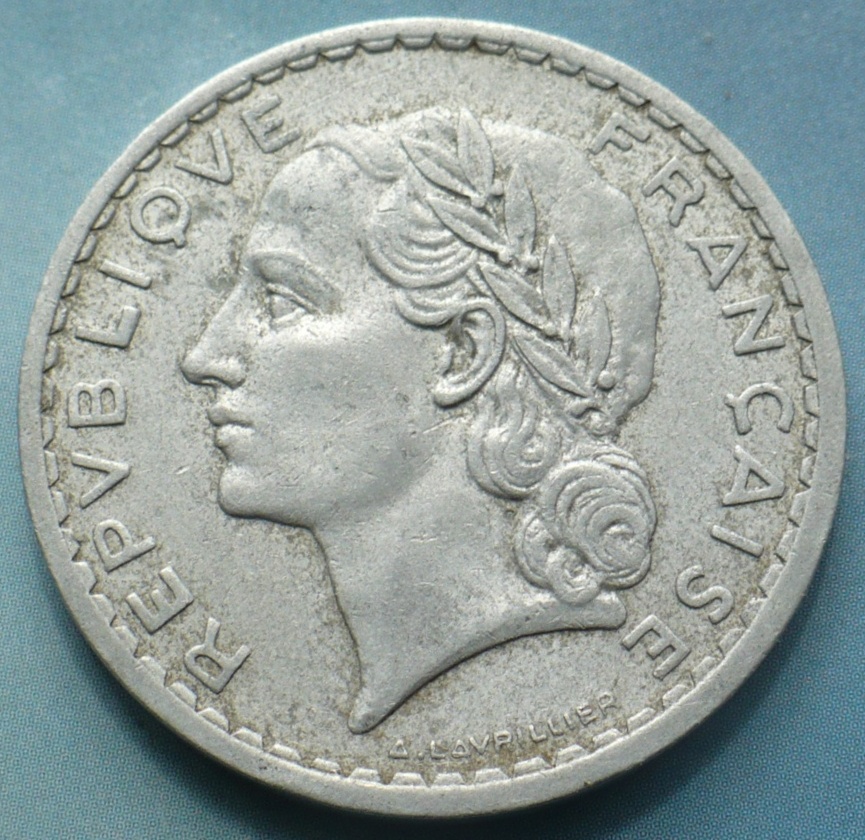 После войны дизайн монет образца 1934—1940 годов не изменился, в обращении были монеты с номиналом 50 сантимов, 1, 2 и 5 франков, выпускаемые из более дешёвого алюминия. В результате продолжавшейся инфляции в 1950 году были введены новые монеты с номиналами: 10, 20, 50 и 100 франков. Банкнота номиналом 50 франков была выведена из обращения. Впервые введена в обращение банкнота номиналом 10 000 франков[25].
