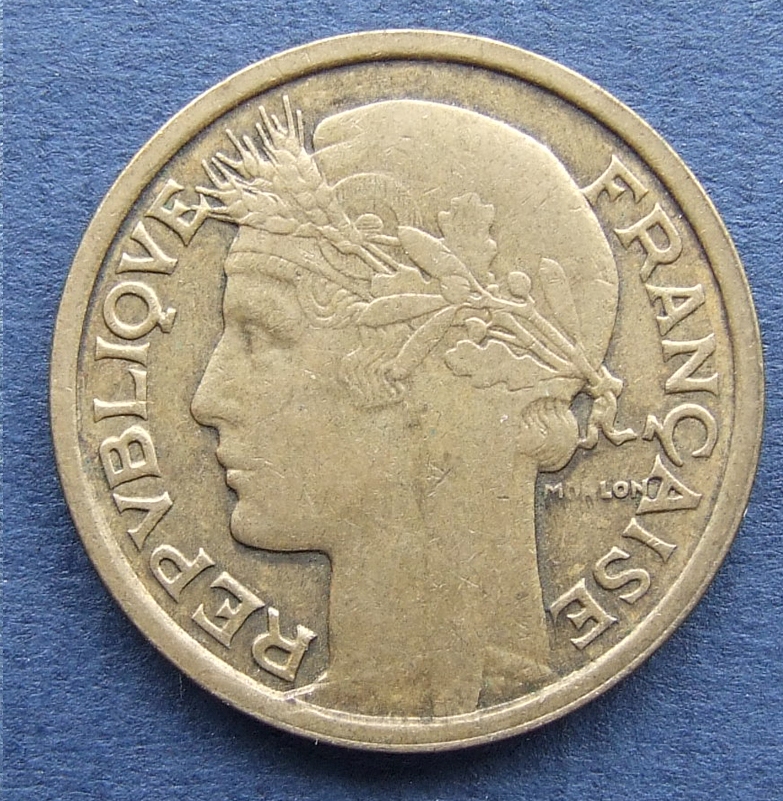 В годы Второй мировой войны вишистская Франция выпускала собственные франки, привязанные к немецкой рейхсмарке. Были выпущены монеты достоинством 10, 20, 50 сантимов и 1, 2, 5 франков. На реверсе новых монет номиналом от 50 сантимов до 5 франков, выпущенных в 1942—1944 годах, был изображён герб Вишистского правительства — средневековый топорик-франциска. Также на монетах присутствовали такие элементы, как фасции и колосья пшеницы (пучок собранных воедино колосьев являлся символом фашизма). На аверсе этих монет девиз Французской республики «Liberté, Égalité, Fraternité» («Свобода, равенство, братство») был заменён на «Travail, Famille, Patrie» («Труд, семья, отечество»).