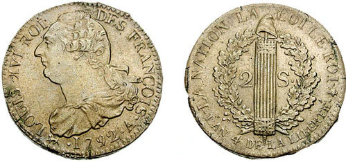 До 1834 года параллельное хождение монет прежней системы (луидоров, экю, су, лиардов) с первоначальным соотношением 1 франк = 1 ливр и 3 денье[59] |
