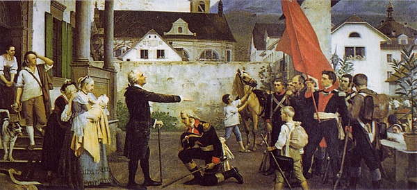 Между тем образ действий французов, наложивших значительную военную контрибуцию на некоторые кантоны, присоединивших к Франции Женеву (в апреле 1798 года) и требовавших немедленного присоединения к Гельветической республике и остальных кантонов, вызвали в последних сильное волнение. Несмотря на свои слабые силы, они начали борьбу с французами и под начальством Алоиза фон Рединга одержали над ними несколько побед под Шинделлеги, Ротентурмом и Моргартеном. Скоро, однако, они вынуждены были уступить в столь неравной борьбе и присоединиться к Гельветической республике.