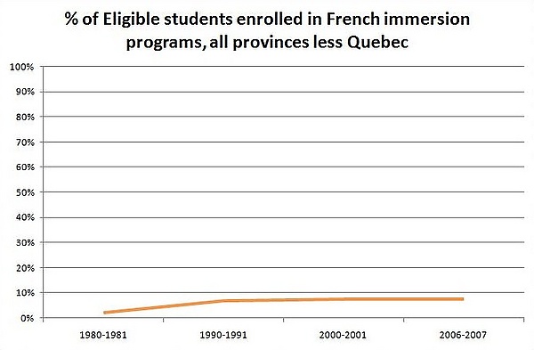 В настоящее время программы французского погружения наиболее популярны в провинции Нью-Брансуик, где французский язык является одним из двух официальных, и на острове Принца Эдуарда. Наименьшей популярностью они пользуются в Саскачеване. Хотя в Западной Канаде наблюдается значительный рост населения из-за притока эмигрантов, он почти не отразился на росте участников программ французского погружения.