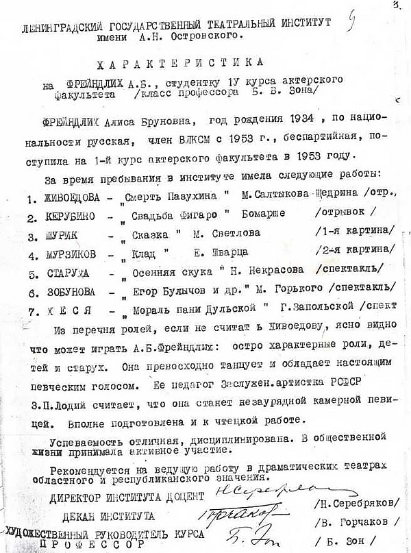 Перед самым выпуском Борис Зон подарил Алисе Бруновне своё фото, написав на обороте: «Милая Алиса! Вы не смеете оставить втуне ни одну из Ваших склонностей: играть, читать, петь, танцевать. Только в таком случае Вы всюду поспеете и будете счастливы»[6]. Он же подписал характеристику, выданную актрисе, подытожив, что Фрейндлих рекомендована на ведущую работу в драматических театрах областного и республиканского значения (см. фото). Дипломный спектакль «Мораль пани Дульской», в котором Фрейндлих сыграла главную роль, помог ей попасть в труппу Ленинградского драматического театра имени В. Ф. Комиссаржевской[9]. Шёл 1957 год[17].