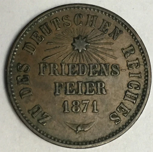 | Описание | в центре восьмиконечная звезда с отходящими от неё лучами, надпись "FRIEDENS-/FEIER/1871". Круговая надпись "ZU DES DEUTCHEN REICHES" |
