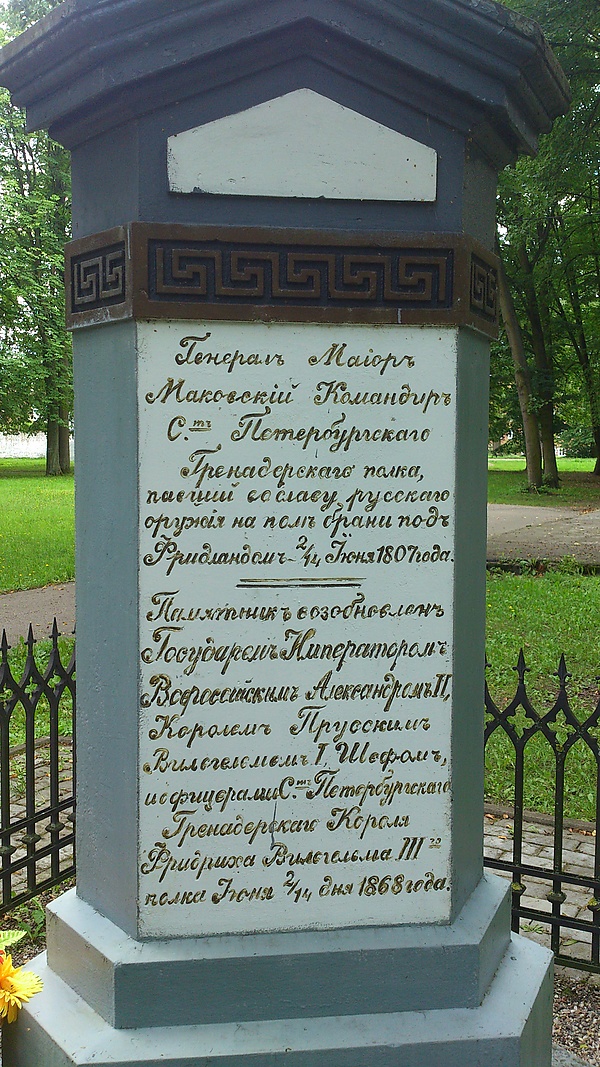 Также в Правдинске на территории городского парка находится «Могила генерал-майора Н. Н. Мазовского, павшего в битве под городом Фридланд 14 июня 1807 года». Она датируется 1868 годом и является объектом культурного наследия регионального значения[13]. Памятник датирован 1868 годом, так как является возобновлённым памятником. Первоначальный памятник-часовня генералу Мазовскому, установленный Фридланским магистратом на кладбище Святого Лоренца, со временем обветшал и в 1868 году был заменён на ныне существующий обелиск. Текст обелиска содержит орфографическую ошибку, допущенную ещё при его создании: Мазовский назван «Маковским».