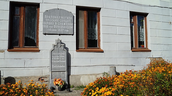 В городе Правдинске (бывший город Фридланд) находится «Братская могила русских воинов, павших в сражении под городом Фридланд 14 июня 1807 года». Она датируется 1807 годом и является объектом культурного наследия регионального значения[11]. Памятный объект состоит из двух мемориальных досок-обелисков, установленных на фасаде бывшего госпиталя, с надписями, соответственно, на русском и немецком языках. В здании госпиталя (сейчас в нём располагается детский сад Правдинска) размещали раненных русских солдат. А умерших в госпитале воинов хоронили у стены госпиталя. Этот госпиталь описан в романе Льва Толстого «Война и мир»[12].