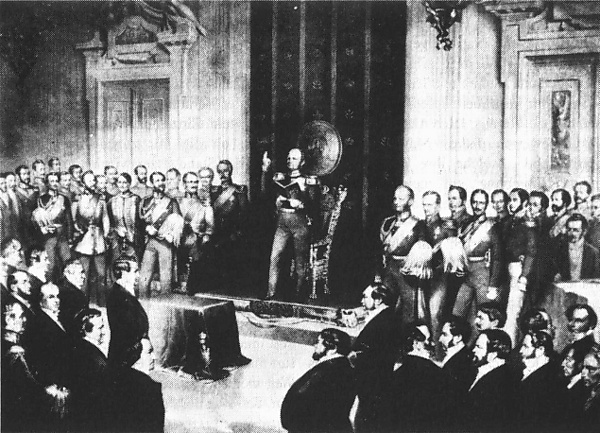 Назначенные конституцией две палаты собрались на первое заседание 26 февраля 1849 года. В первой палате действовал более высокий избирательный ценз, то есть в ней доминировало дворянство. На первых выборах во вторую палату действовало всеобщее и равное избирательное право. Вторая палата сразу имела дело с правительством, признав 21 апреля 1849 года имперскую конституцию. Поскольку это противоречило властным претензиям короля, он распустил вторую палату 27 апреля 1849 года. 20 мая 1849 года чрезвычайным декретом он ввёл трёхклассовое избирательное право для второй палаты. Дифференцированные в зависимости от дохода сильно различающиеся по численности группы отныне избирали фиксированное количество депутатов. С учётом многочисленных предложенных изменений и оговорок в пользу короны пересмотренная конституция вступила в силу 2 февраля 1850 года. В 1853 году король принял решение о наследственной передаче места в созданной верхней палате для определённого круга лиц. Он также оставил за собой право самостоятельно назначать отдельных депутатов. Конституция действовала вплоть до Ноябрьской революции 1918 года.