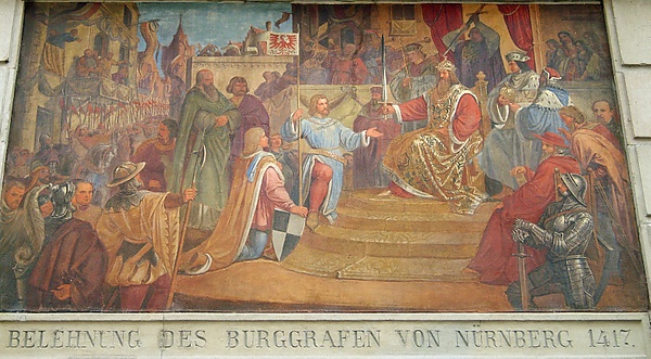 После этого, передав Бранденбург под управление жене Елизавете Фридрих отправляется в Нюрнберг[8]. Это было вызвано с предстоящей коронацией Сигизмунда. Направляясь из Италии в Ахен Сигизмунд ожидал встретить вассалов, а получил холодный приём и интриги. Раздосадованный этим он поехал не в Ахен, а обратно, но по пути 23 сентября 1414 года заехал в Нюрнберг. Фридрих убедил князей удержать Сигизмунда, дабы тот как коронованный император смог завершить церковный раскол. 8 ноября 1414 в Ахене состоялась коронация Сигизмунда как «римского короля» (императорскую корону он получит лишь в 1431 году) и знать отправилась в Констанц на собор[17]. Фридрих ссудил Сигизмунду 250 000 дукатов[18]. На Констанцском соборе 30 апреля 1415 года Сигизмунд, в награду за услуги, оказанные ему Фридрихом, даровал последнему титулы маркграфа и курфюрста Бранденбурга с оговоркой, что может взять у него маркграфство, уплатив 400 000 гульденов. Это было сделано с одобрения курфюрстов, князей, графов и дворян. Формально грамота о пожаловании Фридриха леном была дарована ему 18 апреля 1417 года[10].