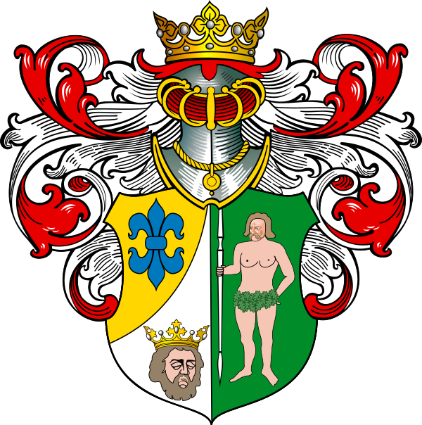 Щит напол-разделенный; в правой его части напол-пересечённой, в верхнем золотом поле голубая лилия, а в нижнем, серебряном, голова в королевской короне; в левой же части щита, в зелёном поле, великан с копьём в правой руке, обращённым остриём вниз.