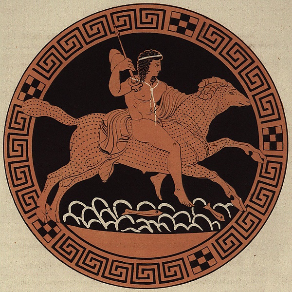 Чтобы спасти своих детей от ненависти второй жены Афаманта Ино, Нефела или Артемида послала им волшебного золоторунного овна, который должен был перенести их в Колхиду. Во время бегства Гелла утонула, упав в воды пролива, получившего имя Геллеспонт («море Геллы»; современные Дарданеллы). Фрикс добрался до Колхиды, где принес волшебного барана в жертву Зевсу Фиксию[6] (Лафистию?) и повесил руно на дубе в роще Ареса[7], либо посвятил руно в храм Ареса[8], по Гелланику, в храм Зевса[9].