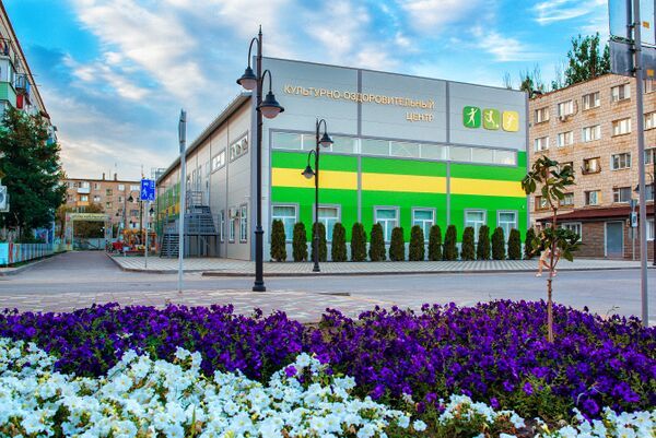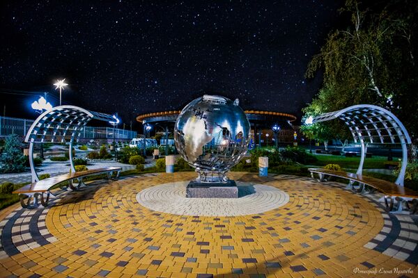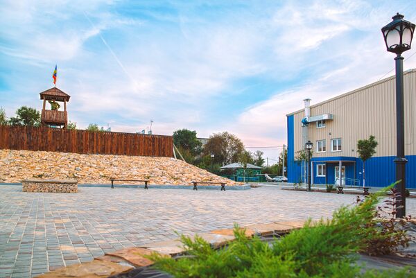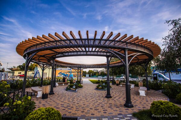 Клумбы цветов, скамейки, заасфальтированные дорожки и аллея из сирени. 70 кустов. В честь 70-летия Великой Победы