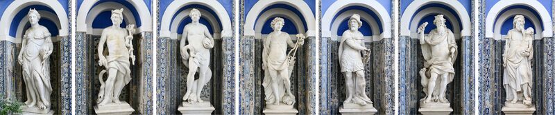 На террасе часовни имеются плиточные ниши, украшенные мифологическими фигурами, олицетворяющими искусство.