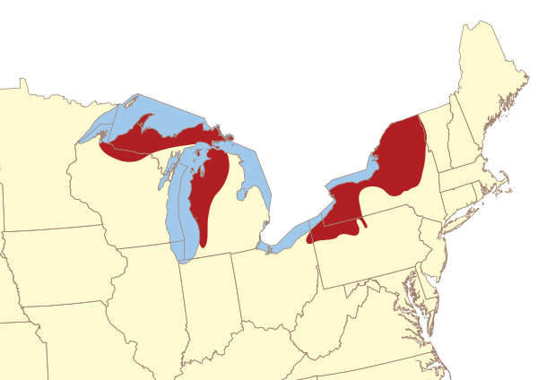 Фруктовые пояса сосредоточены вокруг района Великих озер, в частности, в Западном Мичигане (так называемый Фруктовый хребет), Северном Нижнем Мичигане[1][2][3], и на южном берегу озера Эри[4]. Условия, которые создают микроклимат, благоприятный для выращивания фруктов, в свою очередь благоприятствуют появлению снежного эффекта озера. Из-за этого территория фруктовых поясов частично совпадает с территорией Снежного пояса. На карте справа показаны снежные пояса Великих озер, которые покрывают несколько большую площадь, чем фруктовые пояса. Фруктовый пояс также существует в штате Вашингтон[5].