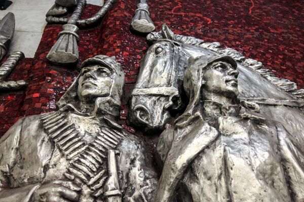 Торцевую часть центрального зала украшает барельеф из алюминия и красной смальты, с изображением М. В. Фрунзе на коне, в окружении красноармейцев и на фоне боевых знамён (скульптор В. И. Сычёв). В проекте архитектора Б. Н. Журавлёва было другое украшение торца — на красном фоне голова Ленина с текстом: «Все силы на выполнение семилетки!»[6].