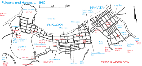 В 1601 году земли Хакаты достались роду Курода, и глава этого рода Курода Нагамаса построил на западе города замок. Он был назван «Фукуока», по имени родины предков Куроды в провинции Бидзэн[4]. Поскольку Хаката стала призамковым посёлком замка Фукуока и столицей княжества Фукуока, она была переименована в Фукуоку, хотя старое название «Хаката» оставалось в обращении до XIX века. В настоящее время Хаката-ку (яп. 博多区) - центральный деловой район города Фукуока.