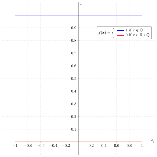 Не является интегрируемой в смысле Римана.[7] Простая функция; измерима по отношению к мере Лебега; интеграл Лебега от функции Дирихле на любом числовом промежутке равен нулю, это следует из того, что мера Лебега множества рациональных чисел равна нулю.