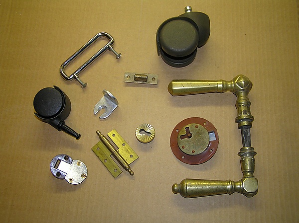 Ряд вспомогательных материалов (петли, шпингалеты, ручки, стяжки, уголки, полкодержатели и т. д.), используемых при изготовлении мебели.