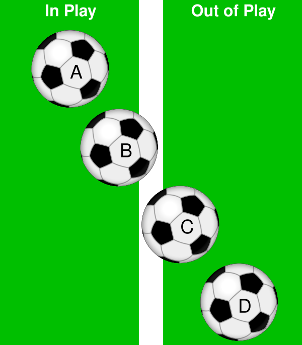 - Вбрасывание мяча (аут). Бросается руками из-за боковой линии. Назначается после того, как мяч эту самую боковую линию пересёк. При этом аут бросает соперник игрока, которого мяч коснулся последним перед уходом за боковую линию[39].