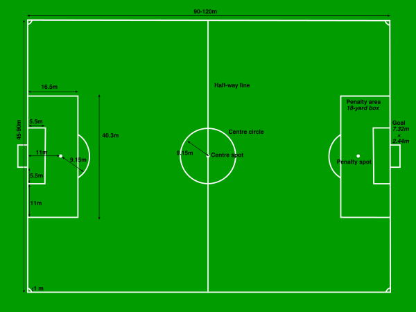 Штрафная площадь: на каждой половине поля размечается штрафная площадь — зона, в которой вратарь может играть руками, а в ворота команды, совершившей в своей штрафной площади нарушение, наказуемое штрафным ударом, будет назначен 11-метровый удар. Размеры штрафной площади — 40,32 м (44 ярда) на 16,5 м (18 ярдов). В пределах штрафной площади, по центру линии ворот и на расстоянии 11 м (12 ярдов) от неё, наносится одиннадцатиметровая отметка — сплошной круг диаметром 0,3 м (1 фут). За пределами штрафной площади проводится дуга окружности радиусом 9,15 м (10 ярдов), центр которой находится на одиннадцатиметровой отметке; данная дуга используется для расположения игроков команд при пробитии одиннадцатиметрового удара[33].