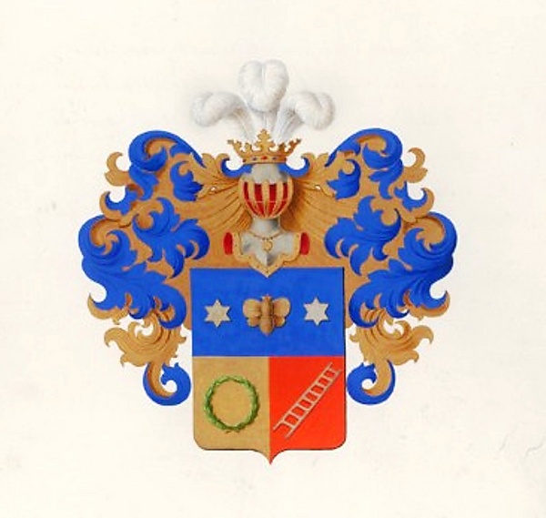 Щит пересечён-полурассечён. В первой, лазурной части, золотая пчела между двумя серебряными о шести лучах звездами. Во второй, золотой части, зелёный лавровый венок. В третьей, черемной (красной) части, серебряная о восьми ступенях лестница, в перевязь влево. Щит увенчан дворянским шлемом и короной. На шлеме — три серебряных страусовых пера. Намёт лазурный с золотом.