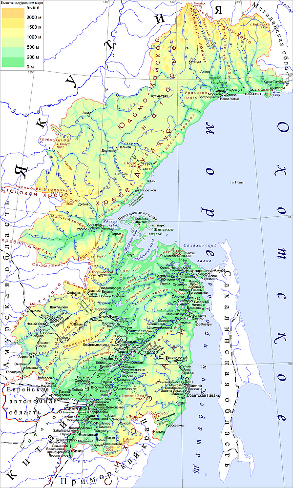 Основные горные хребты: Сихотэ-Алинь на юго-востоке края, Буреинский, Дуссе-Алинь, Баджальский и Ям-Алинь на юго-западе, Сунтар-Хаята, Юдомский и Джугджур на севере. Высочайшая точка — гора Берилл (2933 м), низшая — уровень моря.