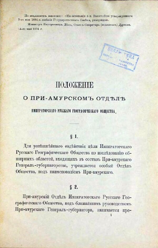 Для успешного содействия цели Императорского Русского географического общества по исследованию обширных областей, входящих в состав Приамурского генерал-губернаторства, учреждается особый Отдел Общества, под наименованием Приамурского.