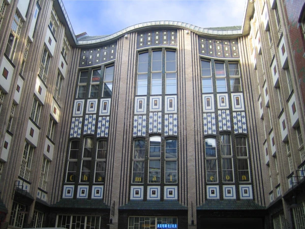 Совсем иной художественный язык использован в зонах, оформленных Энделем, знакомым с философией, психологией и проблемами восприятия. Он стремился воплотить свои теоретические познания в архитектуре и художественном ремесле. В своих трудах он высказывался против эклектики. Созданные им архитектурные работы и интерьеры были призваны передавать движение. За счёт форм, размеров и размещения окон при помощи цветного глазурованного кирпича Эндель создал в первом дворе два разных фасада, которые придали ему вид небольшой площади, со всех сторон окружённой домами. На восточной стороне господствует белый и голубой цвет и мавританские мотивы, а западная сторона, выдержанная преимущественно в коричневых тонах, напоминает очень модные в то время здания торгового дома «Вертхайм» работы Альфреда Месселя.