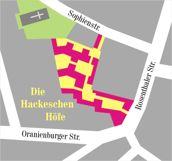 Комплекс дворов напротив Хакской площади открылся 23 сентября 1906 года. Восемь дворов между Розенталерштрассе и Софиенштрассе располагали площадью в 27 тысяч кв.м. на 40 промышленных предприятий, а также для учреждений культуры и жилья.