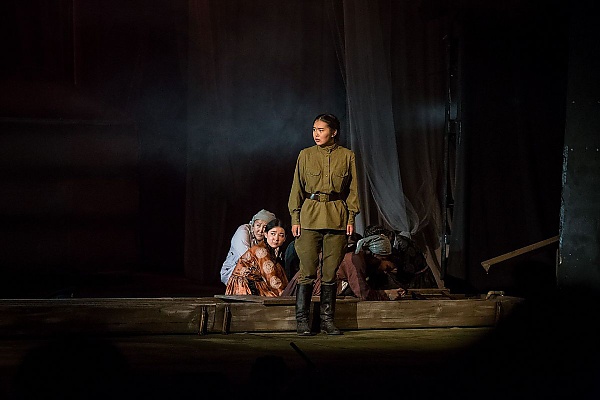 Арюна Цыденова в главной роли Чэмэд-Цэрэн, шестнадцатилетней (в спектакле на всякий случай девятнадцатилетней) доброволицы, поначалу демонстрирует эмоциональную скупость. В ней не чувствуется переживаний юной девушки, оказавшейся в горниле войны. Только монолог о слезах оживляет персонажа, прорывается поток настоящих чувств. Интересно режиссёрское решение создать для этого монолога стену из воды. Вода на сцене используется по максимуму. Актеры постоянно сваливаются в неё, мокнут с ног до головы. Девушки-санитарки по-настоящему стирают одежду в ней. Явная метафора или символ пролитых слёз. И просто попытка добавить динамики.