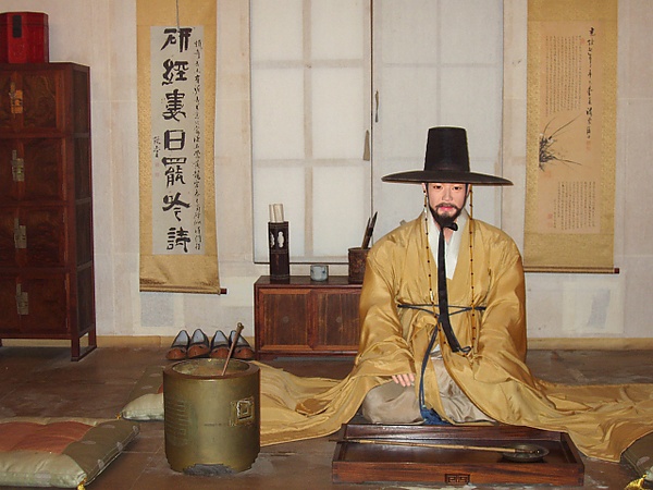 Знать — дворяне-янбаны, служившие гражданскими и военными чиновниками, носили дорогую шёлковую одежду, в то время как среднему классу и простолюдинам ношение шёлковой одежды и дорогих украшений строго возбранялось. Чиновничья одежда состояла из голубого халата с широкими рукавами, по покрою близкого к китайскому времён династии Мин, чогори и широких пачжи из белого шёлка, наголенников и нижних хлопчатобумажных пачжи. Головным убором служила шёлковая шапка с «крылышками» сзади, происходящая из аналогичного китайского головного убора путоу (кит. 幞头)[63].